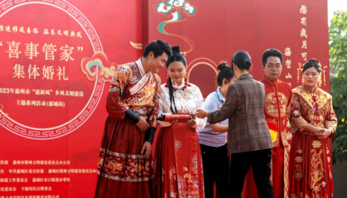 近年来,惠州市深入推进移风易俗,破除陈规陋习、传播文明理念、涵育文明乡风。这场集体婚礼,正是惠州推进婚俗改革的有益尝试。新时代青年以实际行动摒弃世俗婚姻陋习,发扬优秀传统文化,让文明新风吹遍惠州大地。