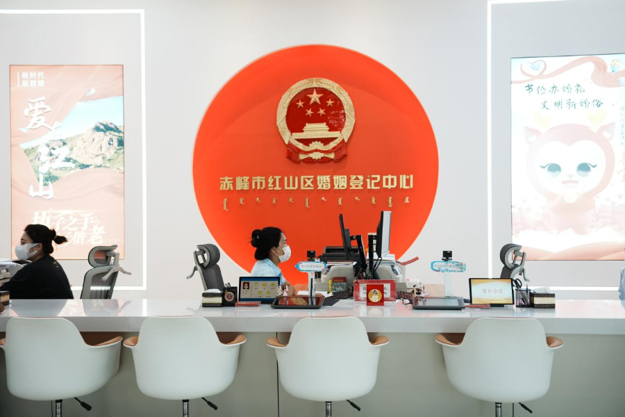 赤峰市红山区婚姻登记中心窗口,为居民提供高效、便捷、温馨的婚姻登记服务。新华网发(赤峰市融媒体中心记者 孙雁南 摄)