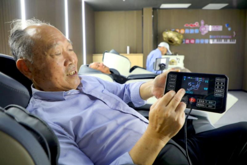 2024年9月28日,安徽省六安市叶集区史河街道柳林社区新时代文明实践站,社区居民一边欣赏音乐一边体验自助式理疗。新华网发(田凯平 摄)