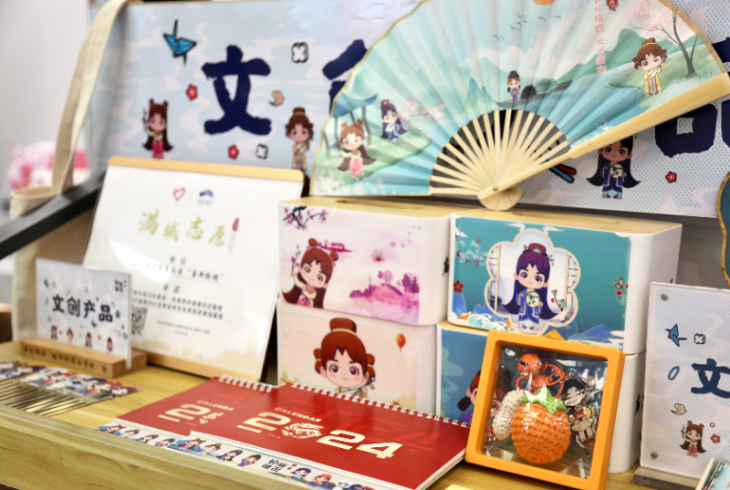 临平区庙东社区新时代文明实践站内展出的文创产品。林凤清 摄