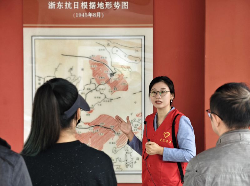10月12日,浙江省级文化特派员邵慧在浙东抗日根据地旧址群进行志愿服务,为游客讲解横坎头村的红色历史。新华网记者钟奕 摄