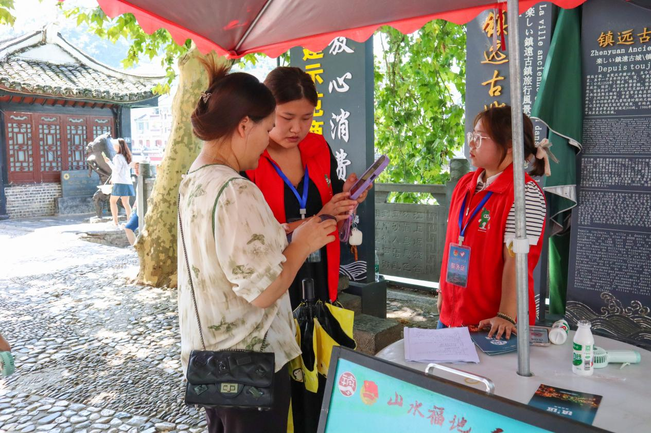 文明实践志愿者为到古城游玩的旅客提供服务。刘青 摄