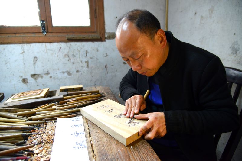 国家级非物质文化遗产代表性项目徽州三雕(婺源三雕)代表性传承人俞友鸿雕刻“诚实守信”微家训。新华网发(吕富来 摄)