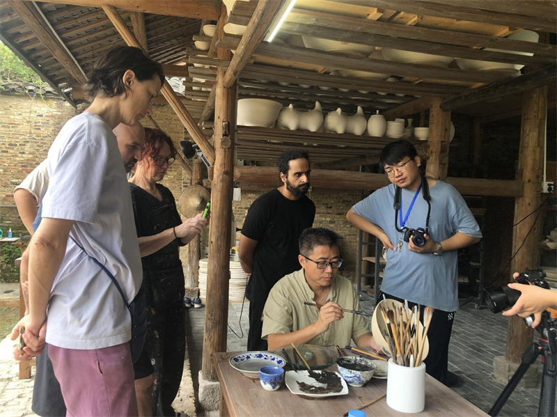 “中国好人”孙立新(右二)为外来游客展示瓷器手工技艺。珠山区文明办供图