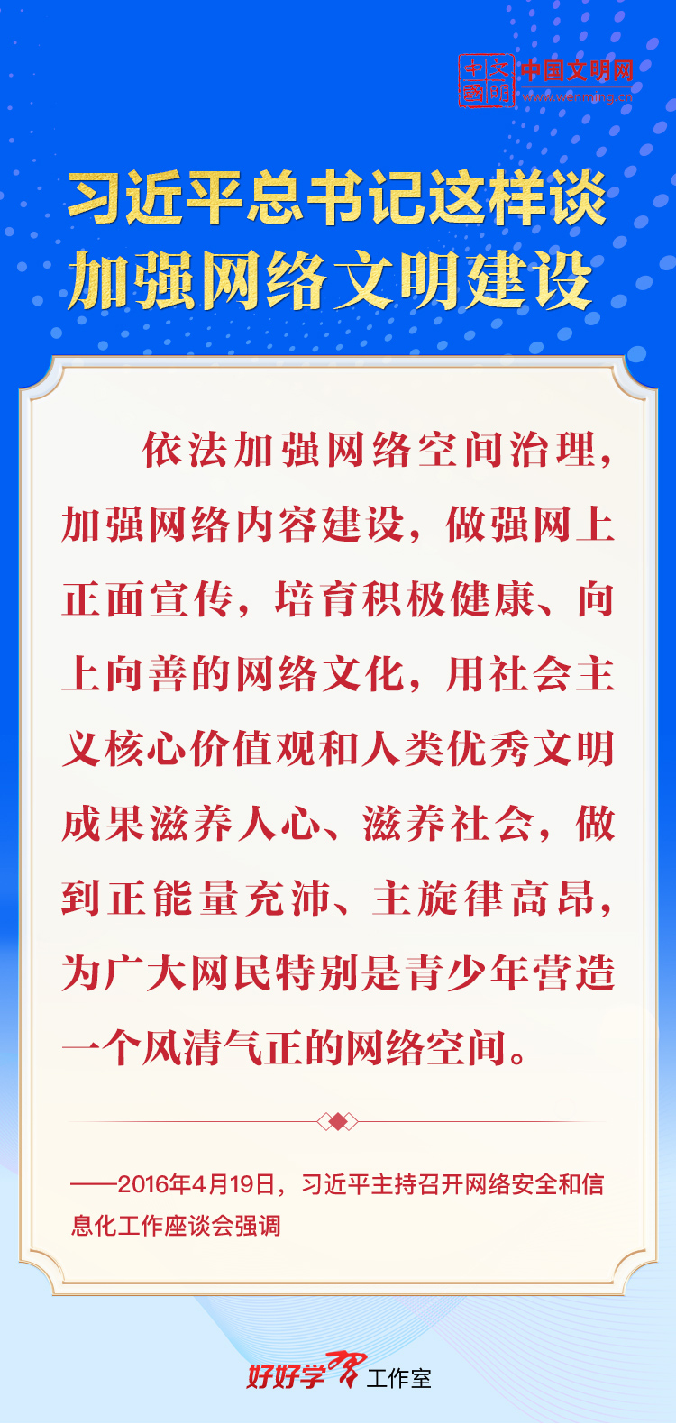 加强网络文明建设,是推进社会主义精神文明建设、提高社会文明程度的必然要求。习近平总书记高度重视网络文明建设,多次就加强网络文明建设作出重要论述,为新时代网络文明建设工作指明了前进方向、提供了根本遵循。让我们一起学习,共建网上美好精神家园。