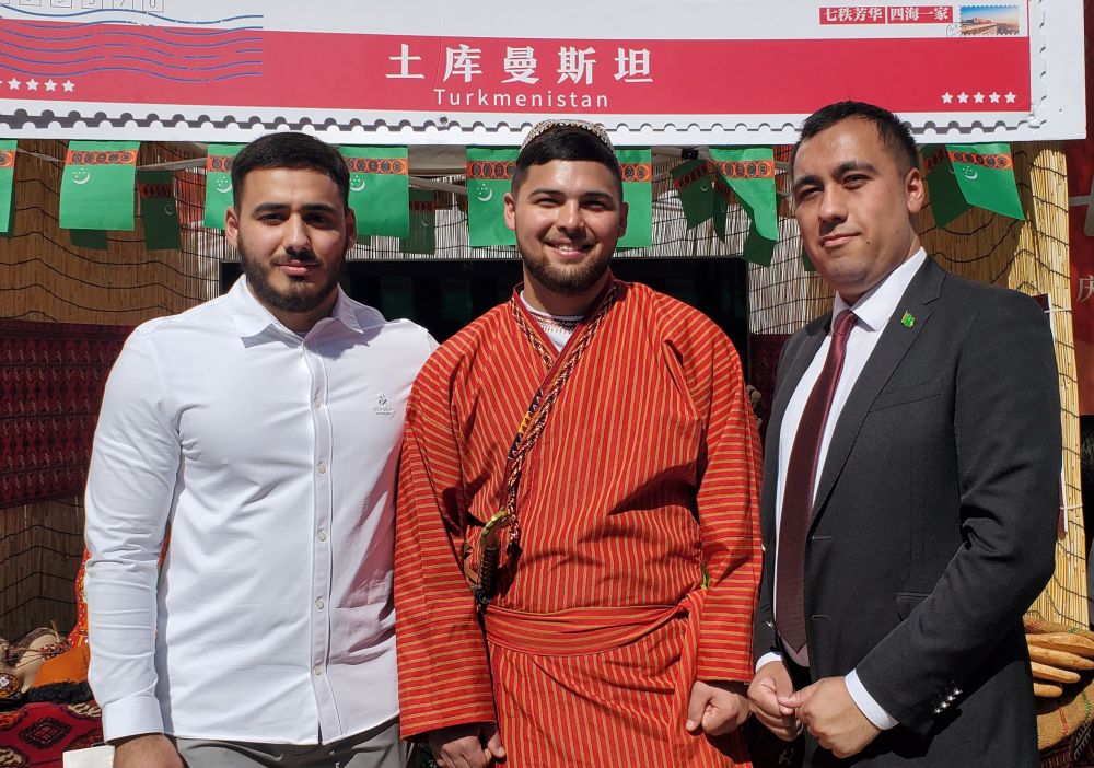 在中国石油大学(北京)第七届国际文化节上,土库曼斯坦留学生若贺曼(右一)与同学们在土库曼斯坦展台前合影留念(2023年10月1日摄)。新华社发
